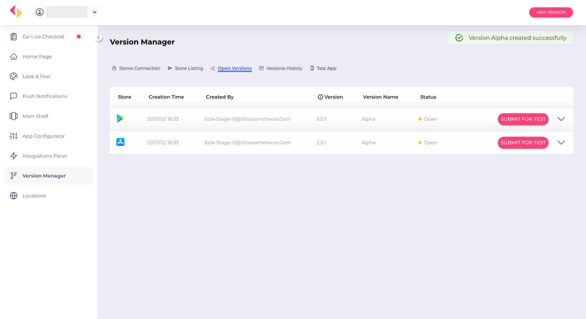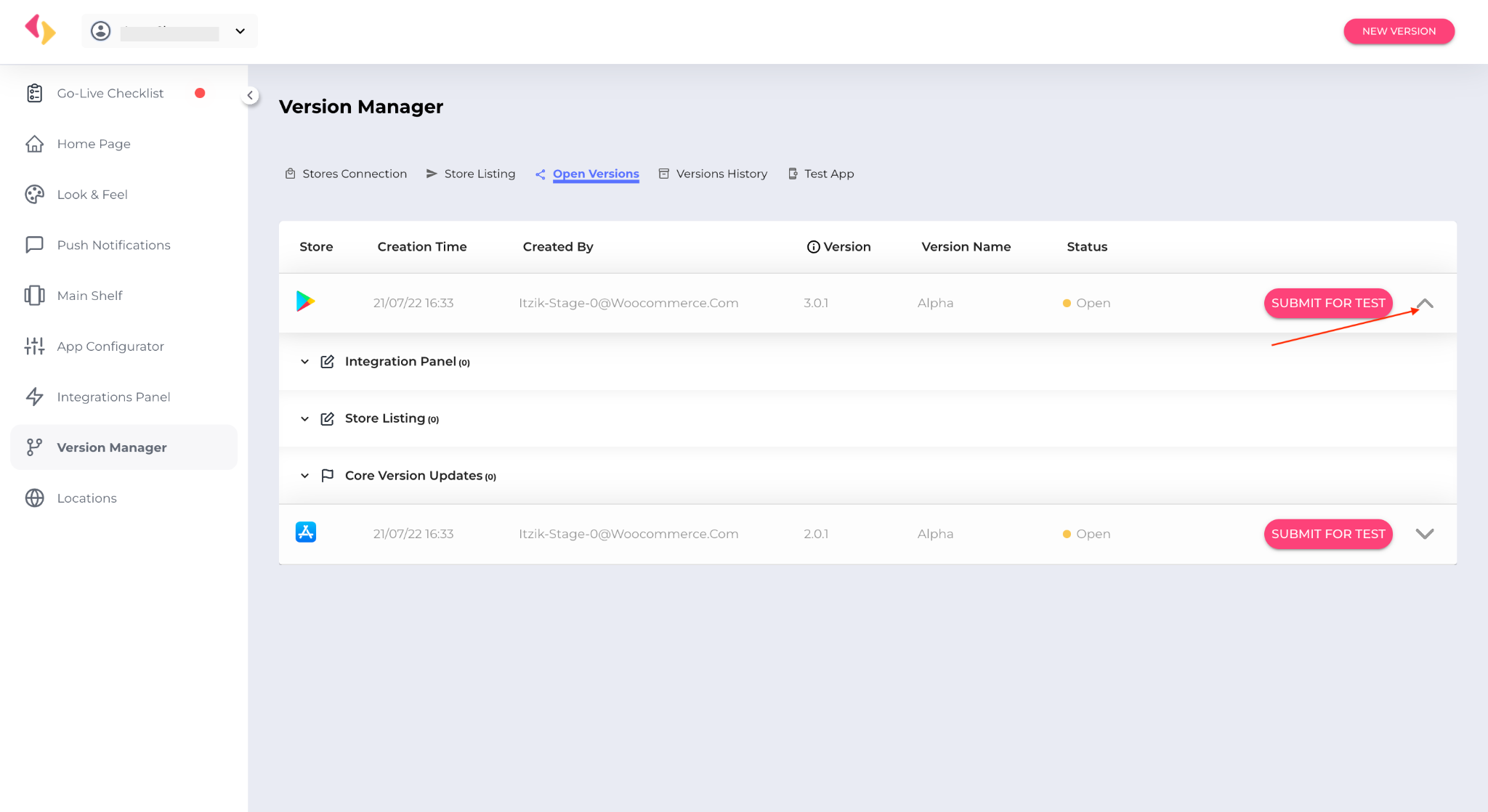 An Open status indicates you can add features from the Integration Panel to the versions. After adding the features, click Submit For Test.